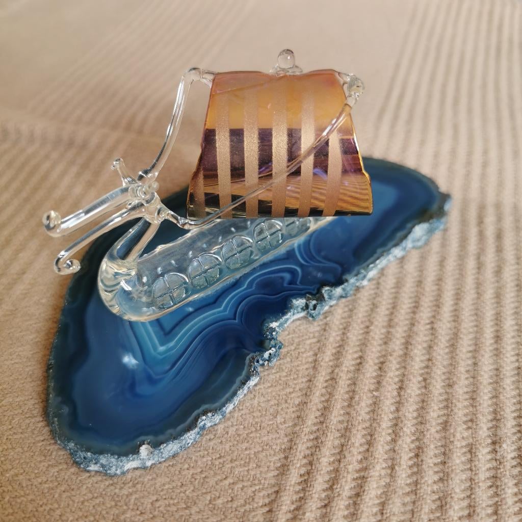 - Drakkar miniatureDiminutif de drakkar ciselé en verre et calcédoine. Mayflower glass. Made in uk. 10,5 Cm long. 5 Cm large. Etat impeccable.Neuf Enlèvement