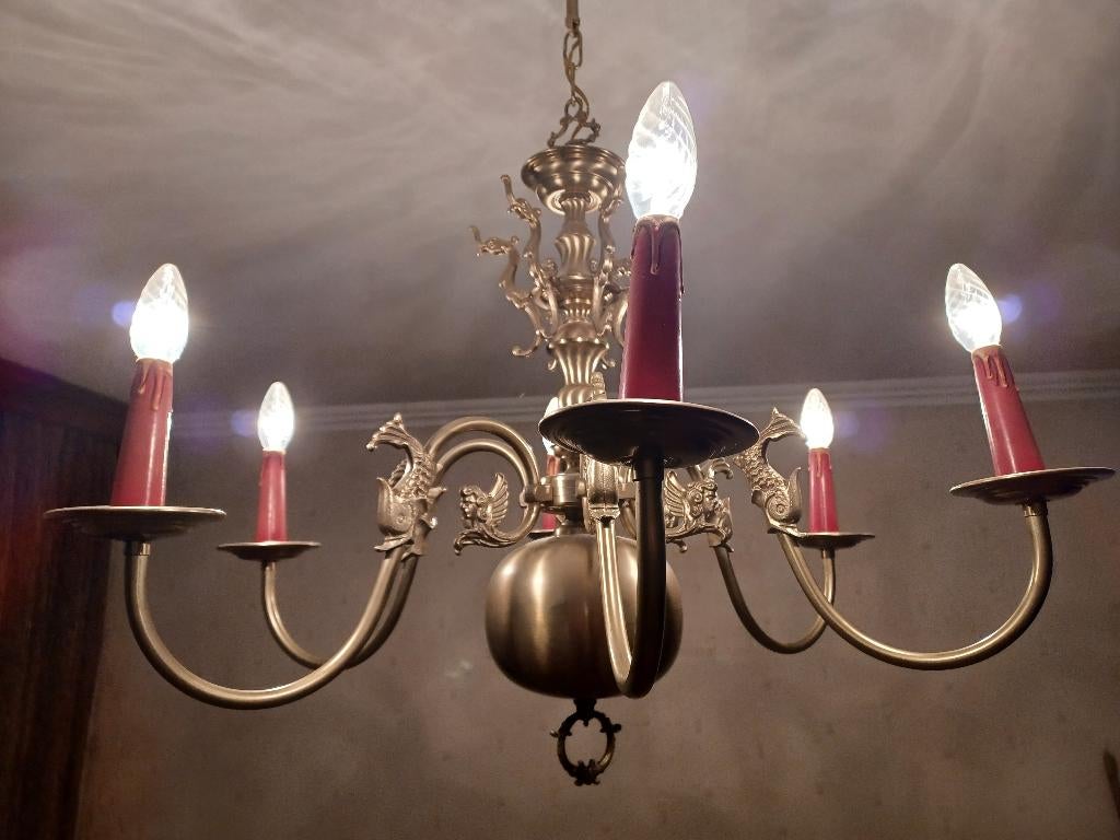 11 juin 25MimBruxelles - 2 lustres en étain ? très bon état, séparément ou ensemble1. Lustre en étain à 8 bras, très bon état avec un motif de poisson sur les bras 2. Lustre en étain à 5 bras, très bon état, peut être acheté ensemble ou séparément, doit être vendu, en raison de la vUtilisé Enlèvement