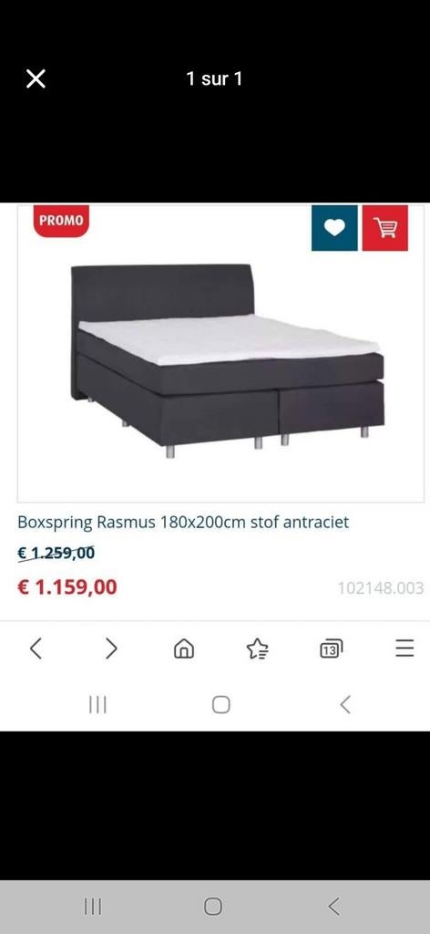 10 janv. 26Luca CarusoIxelles - Boxspringbett Lima – King Size 180x200 – Neuf (sans matelas)Je vends un lit boxspring lima, format king size 180x200, totalement neuf. Jamais utilisé. Vendu sans matelas. Caractéristiques : dimension : 180 x 200 cm hauteur du boxspring (avec pieds) : ~55–60 cmComme neuf Enlèvement
