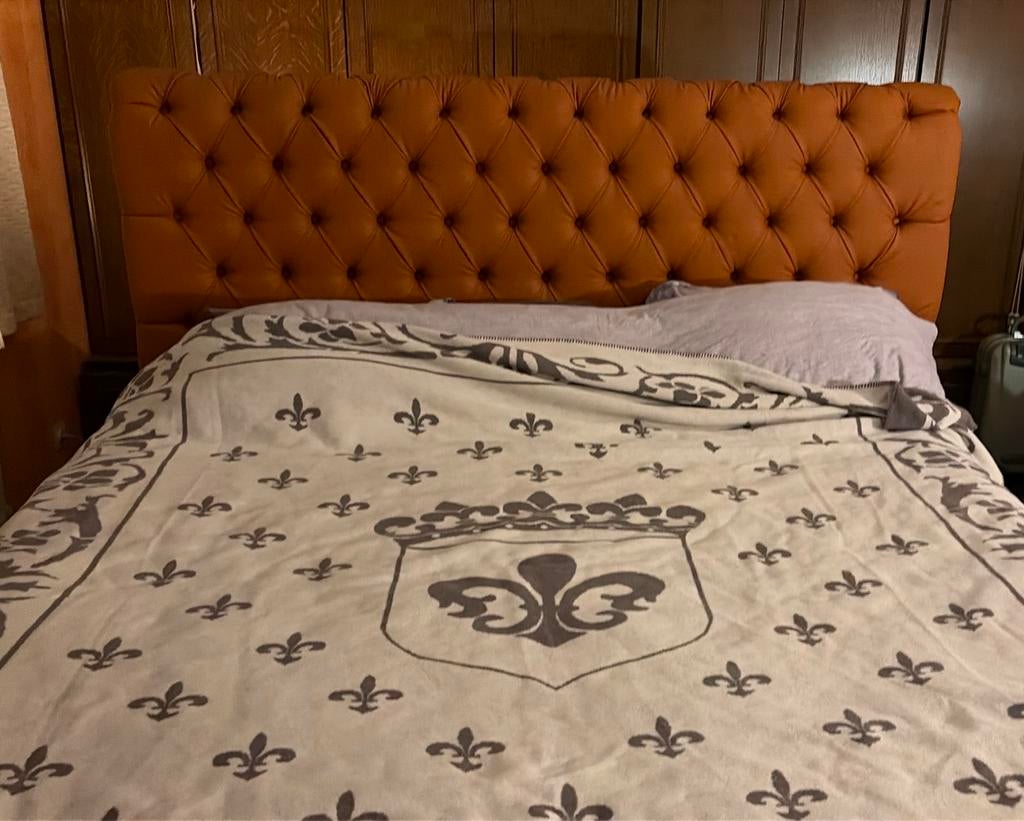 - Lit king sizeGrand lit king size couleur cognac la partie inférieure est composée de 2 parties grande tête de lit de style coffreUtilisé Enlèvement Deux personnes