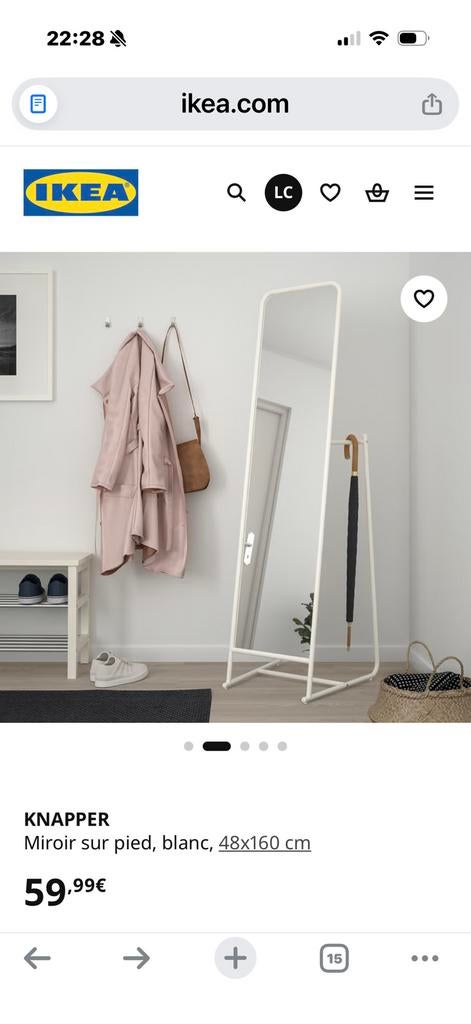 14 avr. 26LiesOostkamp - Miroir sur pied IKEA KNAPPER - Blanc - Très bon étatJe vends mon miroir sur pied ikea knapper, couleur blanc. Très pratique pour les appartements bruxellois : c'est un miroir plein pied avec un portant à vêtements et des crochets cachés à l'arrUtilisé Enlèvement
