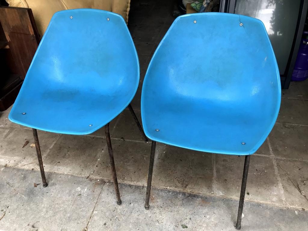 26 janv. 24YSZichem - Paar stoelen Pierre Guarihe voor Meurop, 1960sSet van twee “shell” stoelen van pierre guariche voor meurop, jaren 60. Er zijn enkele kleine scheurtjes (zie foto). Prijs voor de set: €100.Enlèvement
