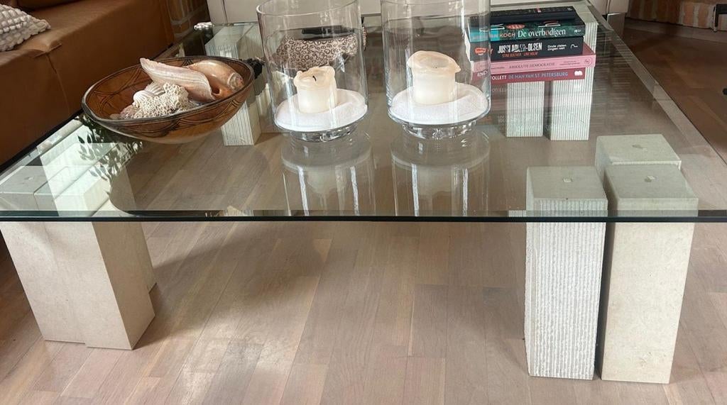 29 mars 26KMineLeuven - Table basse pour salonTable basse rect en verre de salon pied de la table en pierre pierre plus ou moins 1m44 sur1m de largeNeuf Enlèvement