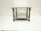 - Table basse - Laiton, Fonte, pâtes - Table pour chevauxTable d'appoint néoclassique de style hollywood regency en laiton et fer forgé avec quatre têtes de cheval en résine, plateau en verre trempé et étagère inférieure miroir, origine europe, période