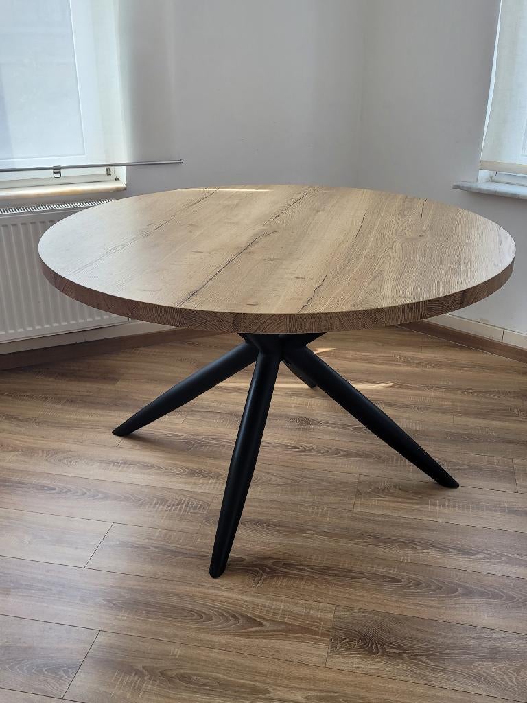 12 mars 26AzouagForest - Table ronde en chêne avec pied noir, diamètre 130 cmLa table est en très bon état, a été vernie avec un vernis pour parquet afin qu'elle résiste aux rayures et aux taches. La table est en bois de chêne de premier choix.Comme neuf Enlèvement ou Envoi Cinq personnes ou plus