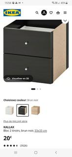 11 févr. 26theo deviaeneGentTiroirs Ikea (noirs) pour armoire KallaxEnlèvement Comme neufGent11 févr. 26 - Etagère IKEAEtagère ikea (kallax) 4 tiroirs et 2 étagères fermées + 4 étagères ouvertes. Couleur brun-noir prix neuf 139,99 € très bon état. Dimensions: l: 147cm l : 39cm h: 77cm les photos montrent 2 étagèr
