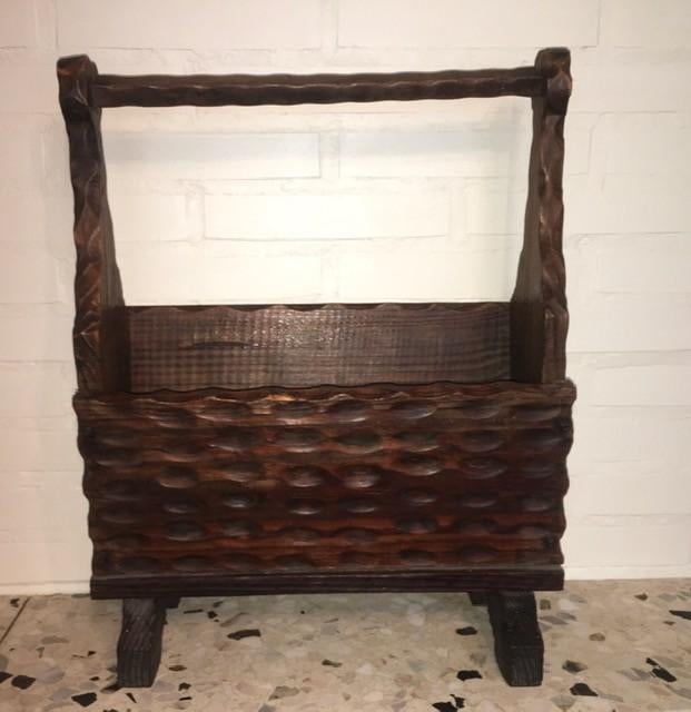 - Porte-journaux espagnol 1950Porte-revues/livres en bois sculpté, style brutaliste espagnol vintage années 1960 bois massif foncé sculpté à la main longueur totale :37 cm hauteur totale: 48 cm largeur 15,5 cm enlèvement sur 1410Utilisé Enlèvement ou Envoi