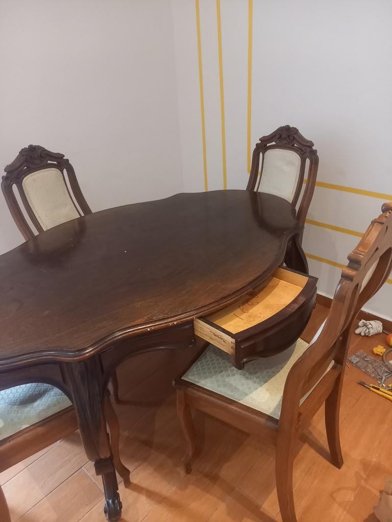 HierAntwerp PhoenixSchoten - Eetkamer merk EbenoUittrekbare eettafel met 6 stoelen en bijpassende dressoir merk ebeno. Kopie franse donkere antiek eikUtilisé Enlèvement