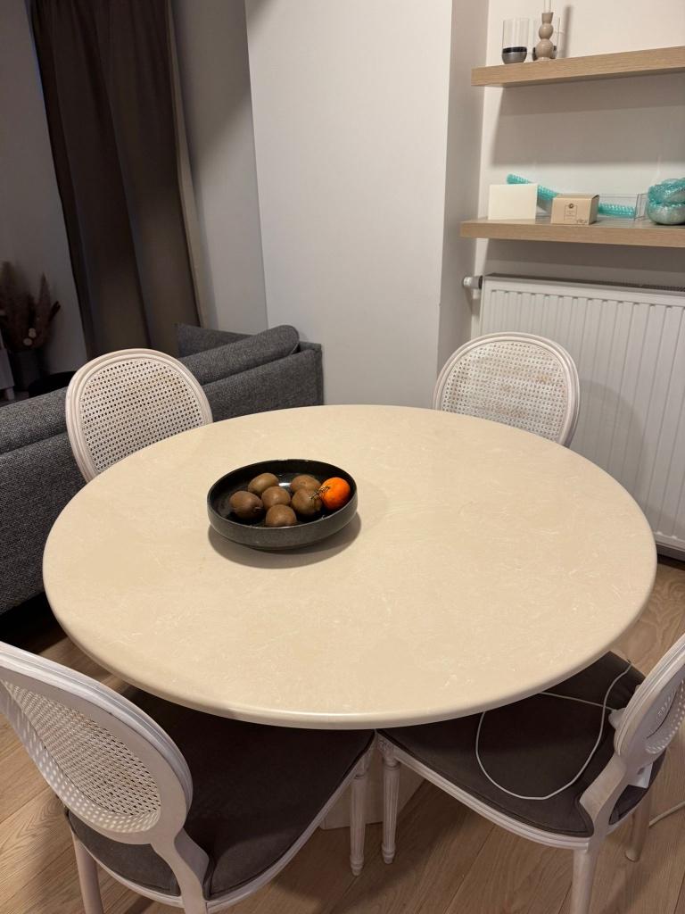 - Table en travertinTable en travertin avec ses 4 chaises dont l’assise a été refaite récemment. La table fait 120cm de diamètreComme neuf Enlèvement Quatre personnes