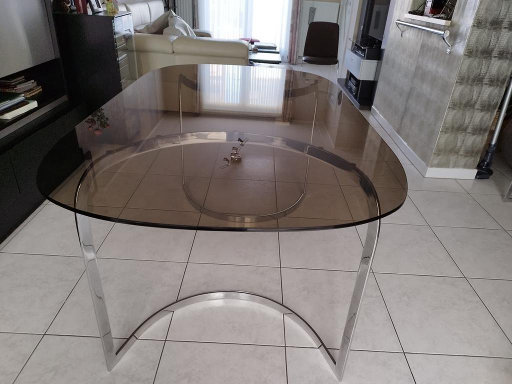 Avant-hierKristofSint-Truiden - Table de salle a mangerTable moderne en verre fumé avec pieds chromés en arc de cercle dimensions : l 180cm /l 100 cm épaisseur 0,5 cm année d'achat : 1974 les chaises ne sont pas à vendreUtilisé Enlèvement