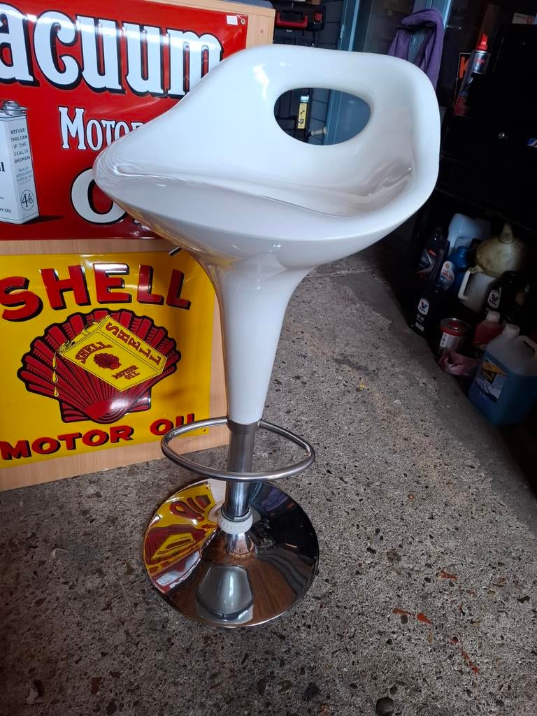 HierJoëlleAnderlecht - 4 tabourets de bar Kastel Kicca PlusFabriqué en italie plastique blanc avec pied central en métal, réglable en hauteur, rotatif et avec repose-pieds.Comme neuf Enlèvement