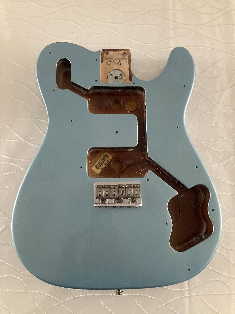 - Body Fender Telecaster Deluxe Ice Blue MetallicVends un corps de fender telecaster deluxe. Il a été reverni en nitro ice blue metallic par mon luthier. Il présente quelques marques d'usure mais est en très bon état. Je le vends avec le chevaleUtilisé Enlèvement ou Envoi