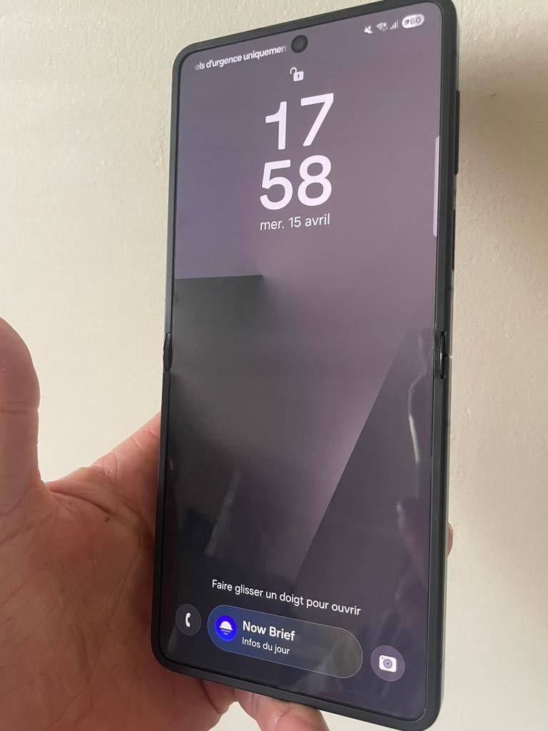 HierPhoneFixers AntwerpenHoboken - Samsung z flip 3Samsung z flip 3 . Fonctionne parfaitement ( aucune coupure de l'écran ) mais ligne lumineuse cadran superieur a droite ainsi petite pliure milieu , cela n'altere pas le fonctionnement ni la v