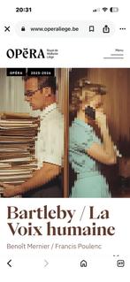 Aujourd'huiSchinsKnokke - Opèra Royal de Wallonie / Bartleby-La voix HumaineDeux tickets catégorie 3 pour le spectacle « bartleby (mernier) / la voix humaine (poulene). Le 21 mai 2026 à 20h à l’opera royal de wallonie liège. Places gagnés pour un podium au 15km de liége. NousMai Deux personnes