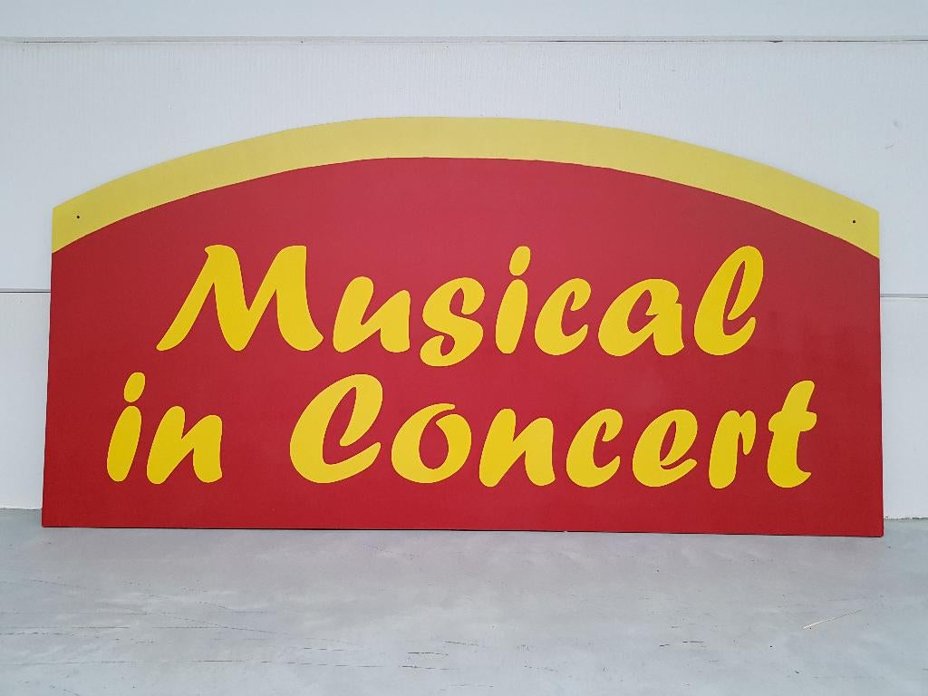 - décor : enseigne publicitaire musicalePanneau publicitaire en bois « musical in concert » - en très bon état - dimensions : l 245 cm - h 122 cm - p 8 mm