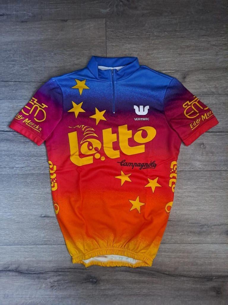 - Wielertrui Lotto Eddy Merckx 1985Mooie koerstrui van het lotto - eddy merckx uit 1985. Het eerste jaar van de lotto ploeg. Mooie vintage wielertrui van meer dan 40 jaar oud, zo goed als nieuw. Ideaal voor een leuke retro rit of als vComme neuf Enlèvement ou Envoi