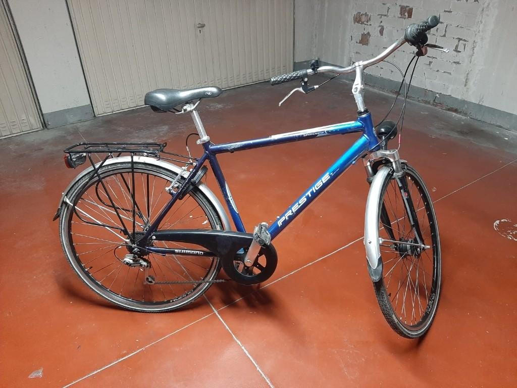 HierTCharlesKruisem - Vélo PRESTIGE 28 pouces 8V en aluminiumBonjour vélo prestige 28 pouces 8 vitesses en aluminium inoxydable. Hauteur du cadre: 49 cm de l’axe du pédalier à l’axe de la selle. Réglages possible sur place pour un essai. ÉClairage avant et l’arComme neuf Enlèvement