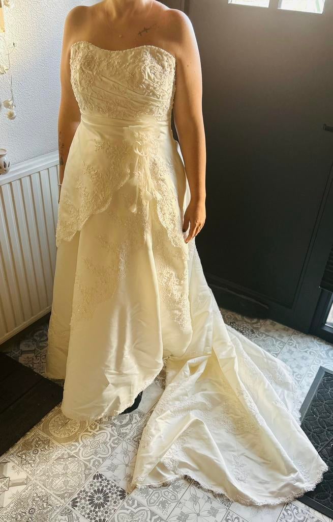 - Robe de mariée en tulle brodéUne magnifique robe de mariée sans bretelles signée linea raffaelli, avec une belle dentelle et une belle traîne en tulle. La robe est allée au teinturier. Porté une seule fois. La robe n'a pas étComme neuf Enlèvement ou Envoi