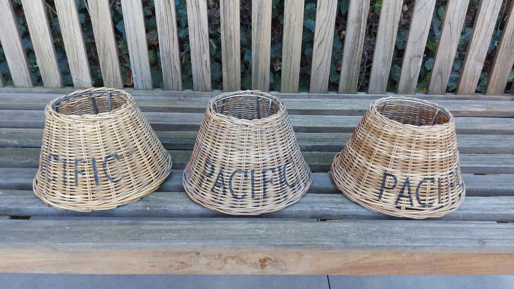 7 avr. 26Pub au topCatawikiToute la Belgique - 3 abat-jour en rotin3 abat-jour en rotin avec l'inscription "pacific ". Diamètre base : 24 cm, haut : 14 cm. Structure métallique, finition en rotin. Bon état.Enlèvement ou Envoi