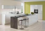Cuisine ilwa en hêtre stratifié, intérieur en stratifié blanc, poignées en acier inoxydable, plan de travail en granit jasberg de 3 cm d'épaisseur, avec table extensible et appareils intégrés (plaque de cuisson kuppersbush, hotte, lave-vaisselle ...