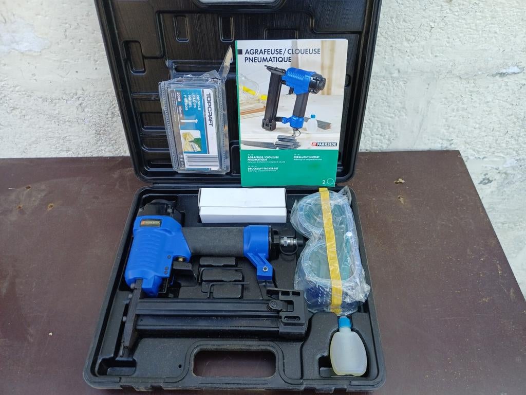 - Cloueuse agrafeuse pneumatiqueAgrafeuse/cloueuse pneumatique parkside fonctionnalité : outil 2-en-1 pour agrafer et clouer avec précision. Compatibilité : conçue pour des clous de 15 à 50 mm et des agrafes de 10 à 40 mm. PressionEnlèvement