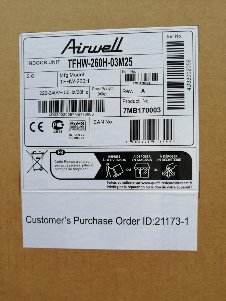 - Chaudière à pompe à chaleur monobloc Airwell TFHW Eleo 260 2Chaudière à pompe à chaleur monobloc airwell tfhw eleo 260 l en inox 7mb170003 - mise à jour : 11/04/2025 - votre prix net = 1695€ tva comprise - avec facture + garantie - article toujours en stoNeuf Enlèvement