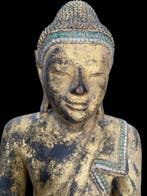 - Groot antiek houten Boeddhabeeld – Mandalay stijl - Beeld -Antiek handgesneden houten boeddha-beeld uit mandalay-stijl, uit birma, hoogte 53 cm, breedte 30 cm, diepte 20 cm, ongesigneerd, in goede staat met vergulde patina en inleg van gekleurde glas- of spie
