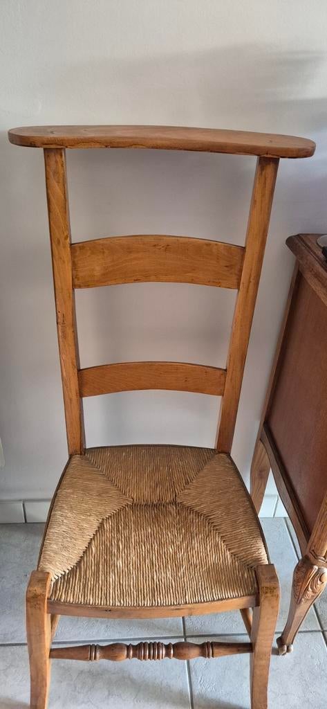 16 mars 26HiwdeLonderzeel - Antieke bidstoel met rieten zittingDeze houten prie-dieu stoel (gebedstoel) is een antiek meubelstuk ontworpen voor privégebed. Functie: de stoel is voorzien van een hoge, smalle rugleuning met een plankje aan de bovenkant om op te leuEnlèvement