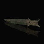 - Bronstijd dolkDolk uit het brons-tijdperk, circa 34 cm lang, met een slanke lemmet en centrale rib en een handvatgebied dat op een houten of botten grip wijst; in goede gerestaureerde staat met olijfgroene patina e