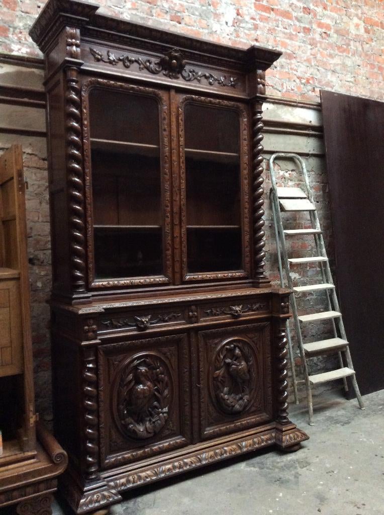 4 avr. 19frankyGeel - Antieke kast, jachtstijl. Eind 19e eeuw- begin 20e eeuw.1.7M breed 57 cm diep 2.25M hoog grote massieve jachtkast met rijk handgesneden details zoals jachthoorns, wildmotieven, bladeren en ornamenten. Eikenhout, donker gebeitst met vitrinedeel bovenaan enEnlèvement