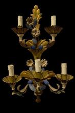 - Applique murale (2) - Fer forgéPaire d'appliques murales vintage en métal doré, style hollywood regency / florentine (tole), motifs floraux peints à la main, abat-jour en forme de bougie avec effet cire fondue, environ 1950–197