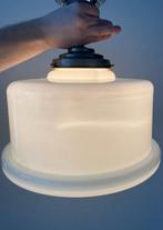 25 août 25KristelBoutersem - Lampe à suspendre - Opaline - Plafonnier art décoLampe suspendue art déco datant de 1930–1940, abat-jour en verre opaline blanc et partie supérieure en métal; environ 40 cm de haut, 35 cm de largeur, 35 cm de profondeur, poids 5 kg, une douille, ori