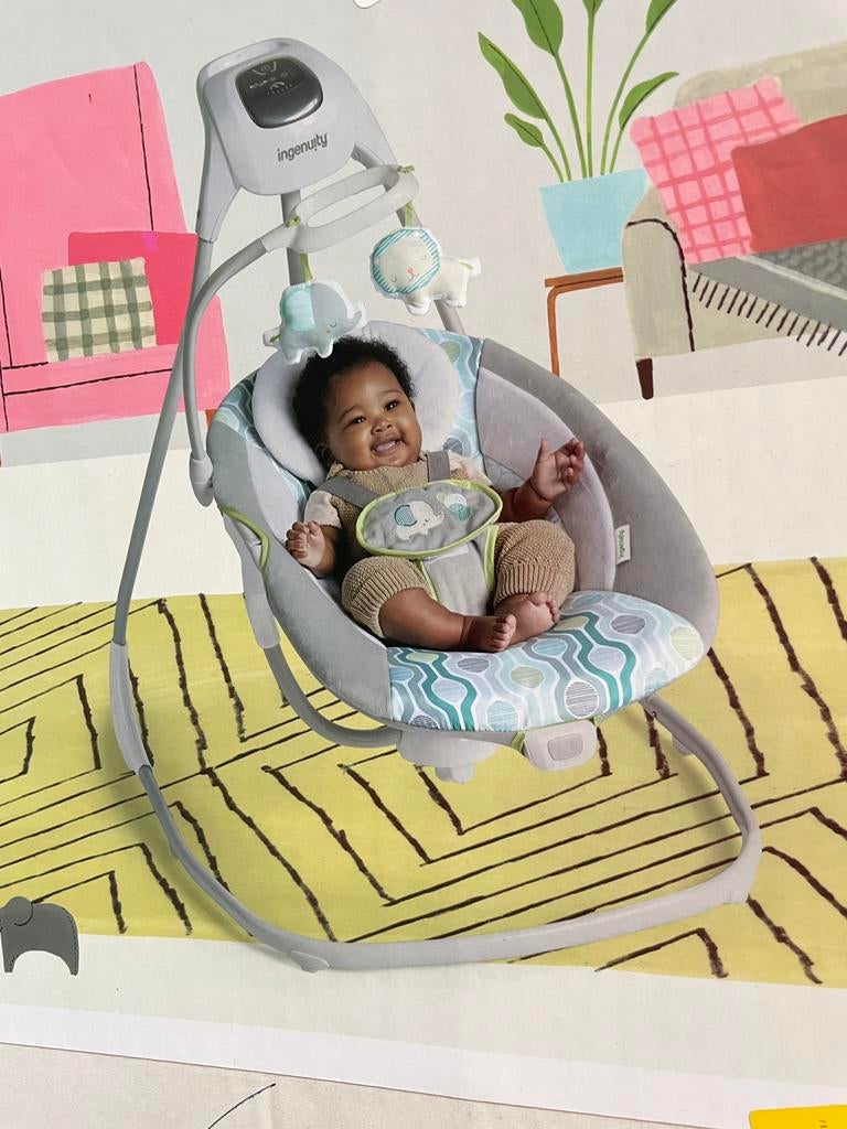 12 mars 26geneCBraine-L'Alleud - Balancelle INGENUITYBalancelle ingenuity comprenant les options et accessoires suivants : • 6 vitesses pour s'adapter au poids du bébé • balancements latéraux (gauche-droite) • mobile avec 2 figurines • musique ou br