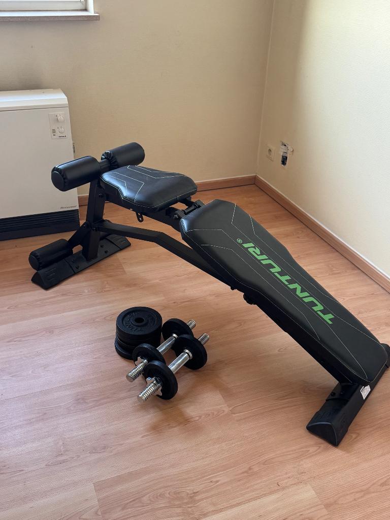 - Banc Tunturi + squat rank + banc abdominal +2 haltèresBanc tunturi + banc d'accroupissement + banc pour muscles abdominaux +2 haltères dans chaque chambre, il y a 15 poids différentsEnlèvement