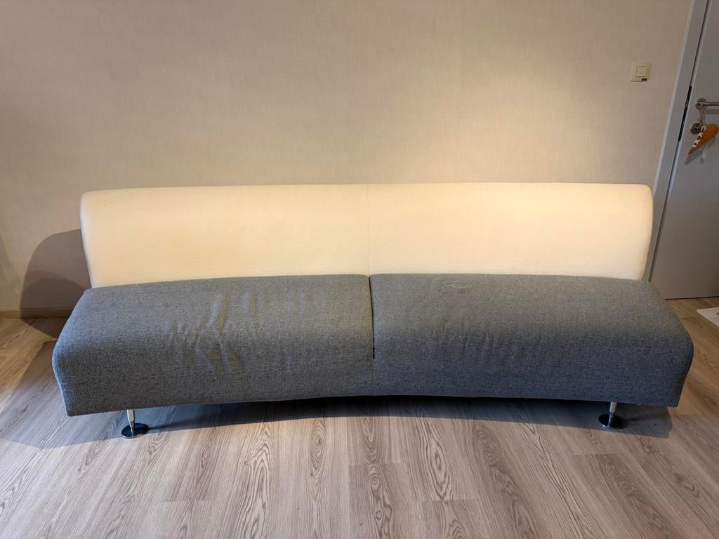- Canapé en arc de cercle beige et grisCanapé en petit arc de cercle, super style pour une touche un peu vintage. Il est en super état, prêt à être embarqué mais ne se démonte pas (sauf les pieds). Il y a quelques traces d’usures à l’arrièComme neuf Enlèvement Quatre personnes ou plus