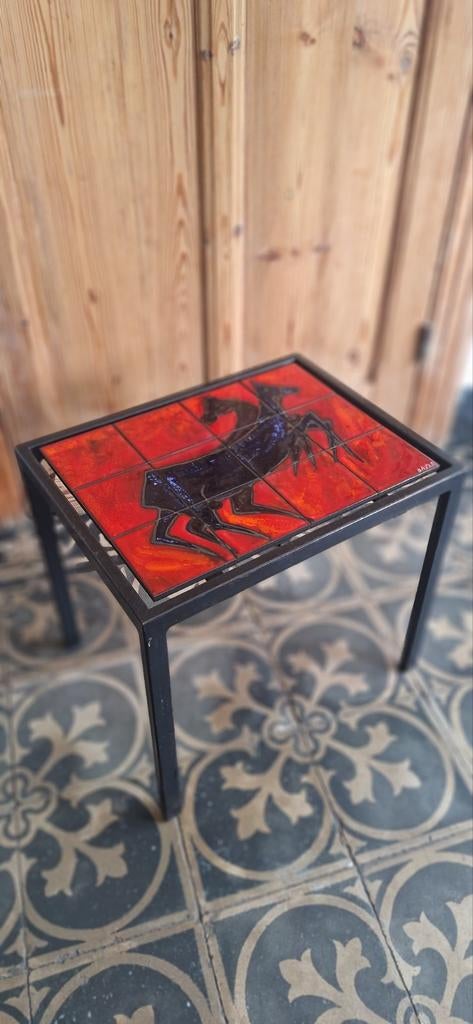 15 mars 26Caroline L.Froyennes - Table basse en céramique d'A. BayerTable basse d'appoint des années 70 en céramique représentant des chevaux, signée andré bayer, artiste bruxellois . Cadre et pietement en métal noir. Bon état général malgré les traces d'usureUtilisé Enlèvement