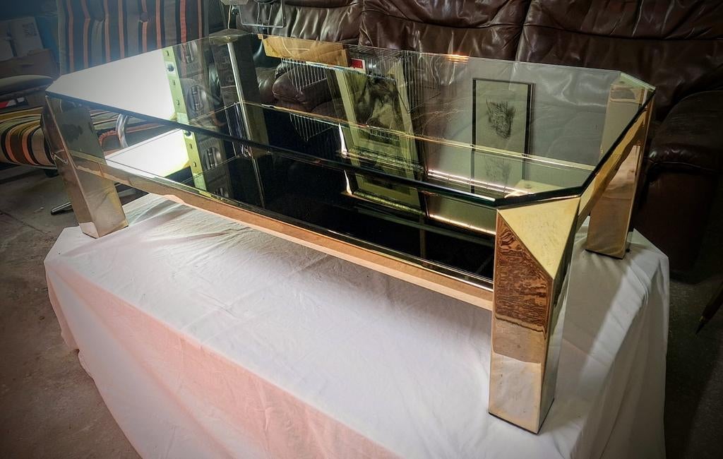 29 oct. 25DennieWondelgem - Midcentury salontafel van Belgo ChromMidcentury salontafel van belgo chrom met verguld kader en 2 x blad in rookglas en spiegelrand. 130 X 70 x 37 cm. 250€ afhaling langemark w-vl (2826-63) 1725Comme neuf Enlèvement