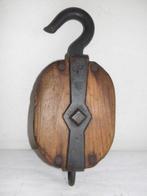 - Objets maritimes - Bois et fer forgéPoulie ancienne lourde du commerce maritime de la mer baltique nord-est au xixe siècle, estimation 1800–1850, en bois et fer forgé, avec deux roues tournant librement, un berceau en fer forgé portant