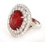 Bague en or blanc 18 carats avec une émeraude ovale rouge et 52 diamants naturels autour (diamants en taille brillant, couleur f-g, pureté vvs/si, total 4,18 ct), poids total de la bague 17,55 g, fabr