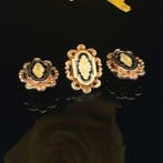 Avant-hierHandelsbedrijf OtteZelzate - Ensemble de bijoux 3 pièces - 14 carats Or jaune - BoutonsBoutons de revers vintage pour veston masculin en or jaune 14 k (poids total 3,90 g), sans rapport de laboratoire, émaillés noir et jaune translucide, datation environ 1840, livrés dans leur boîte d’o