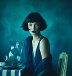 - La Mama - Bleu Silence - XL- Œuvre unique 1/1Blauw stilte – uniek doekwerk xl 1/1 door la mamain een bijna onwerkelijke, blauwgetinte sfeer lijkt een vrouw met een kalm en diep kijk in de tijd te zijn opgehangen. Haar elegante silhouet, omhuld d