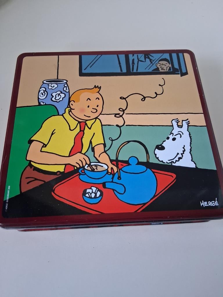19 août 24JacbarHuy - Boite métallique Tintin Milou thé Lotus bleu dragon HergéBonjour, je vends une boite de biscuits de tintin, de couleur rouge. Description: personnages: tintin et milou autour d'une table pour le thé marque: tintin matière: métal couleur: rouge et multicUtilisé Enlèvement ou Envoi