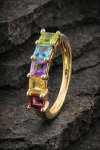 Aujourd'huiPub au topCatawikiToute la Belgique - 925 zilver - natuurlijke sierstenen (peridot, blue topaz,Rainbow elegance is een damesring van 925 sterling zilver met een gouden vergold afwerking, met vijf natuurlijke vierkante multikleurige edelstenen (peridot, blå topaas, ametist, citrien en rhodoliet)