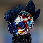 Poisson-ballon décoratif en verre, conçu et fabriqué au milieu du xxe siècle (environ 1950–1975), hauteur environ 16 cm, largeur 15,5 cm, poids 811 g, avec des plaques de verre blanches et colorées et des cannes millefiori, nageoires en verre bleu, y...