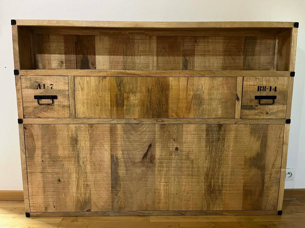 22 mars 26CattelainAth - Tête de litTête de lit avec rangements en manguier massif l140 cm manufacture finition bois naturel poignées et plaques : métal vieilli 2 tiroirs et 1 niche marque : maison du mondeUtilisé Enlèvement