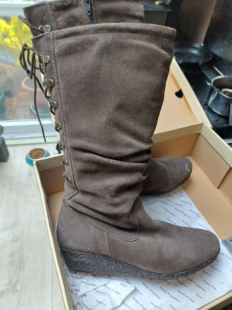 - Bottes en daim Hush Puppies marron Mt42 (mollet 140e plus laIdéal avec un laçage pour les personnes aux mollets plus larges. Quelques places sur = prix inférieur.Enlèvement ou Envoi