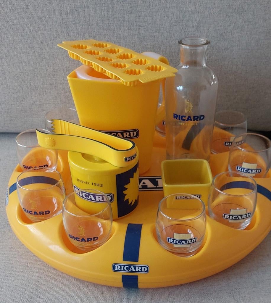 - Bouée ricard garnieBouée ricard avec 10 verres ricard ( 5 verres de chaque sorte) , un ranquin , un bac à glaçons, 1 pince, une bouteille demi soleil, une cruche à eau et un moule à glaçons soleilEnlèvement ou Envoi