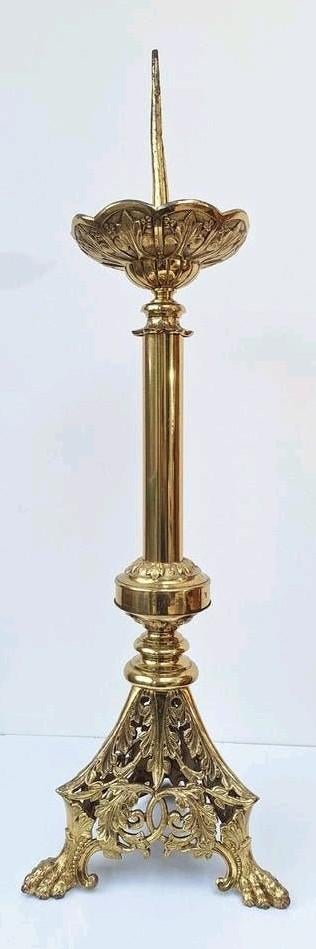 11 mars 26BiggieMRoeselare - Très beau grand bougeoir d'église doréTrès beau grand chandelier d'église, probablement pour une bougie de pâques. Pied magnifiquement élaboré et richement décoré. La pointe supérieure est longue et présente quelques bosses dues à l&#Enlèvement