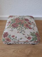 Avant-hierPub au topCatawikiToute la Belgique - Ottoman - Bois, Textile, CuivrePouf en bon état, tissu présentant de jolis motifs, orné de clous cuivre et pieds boules; origine europe; dimensions 30 cm de largeur, 30 cm de profondeur, 15 cm de hauteur; matériaux bois, textile, c