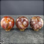 - Boules naturelles en bois pétrifié – ensemble de collectionEnsemble de trois sphères en bois fossilisé originaires de madagascar, présentant une marquure unique et une finition polie, poids total 1414,84 g.